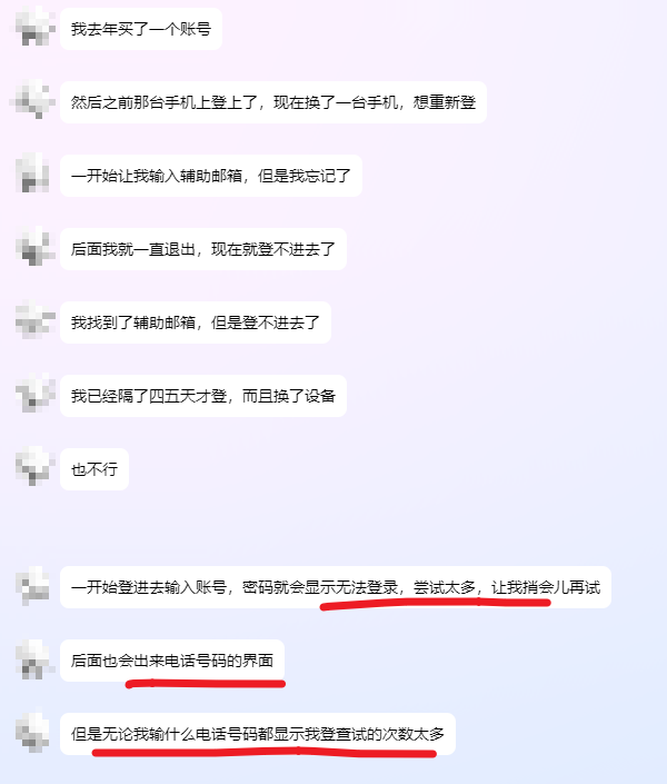 这个朋友的账号是买的(自己注册的也一样),换了手机以后,一番操作,登录的时候提示无法登录,尝试的失败次数过多。出现手机验证界面,换多个手机号都不行。