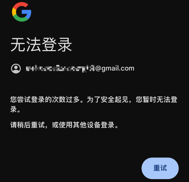 然后我代他登录,也是提示尝试登录的次数过多,为了安全起见,暂时无法登陆。请稍后重试,或使用其他设备登录。