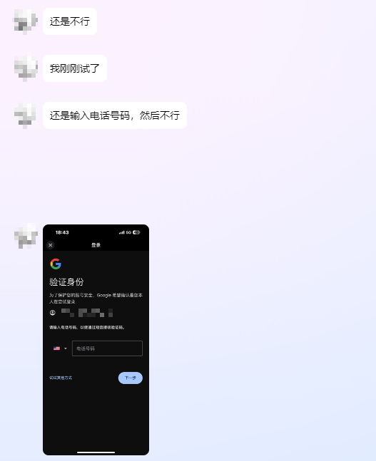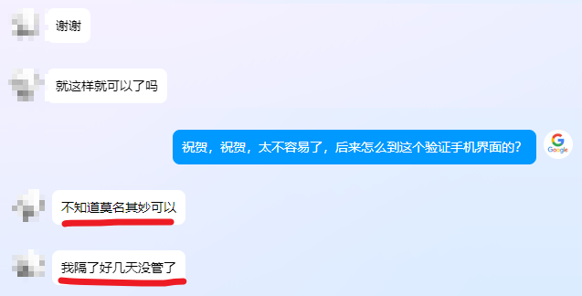 然后使用自己的号码还是不行,我给了他谷歌接受的高质量手机号码以后,就顺利登录,恢复了账号。