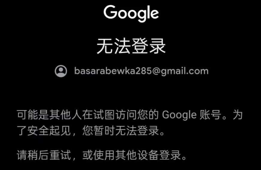 多个朋友在登录自己已有谷歌账号的时候,提示账号无法登录,可能是其他人在视图访问您的Google账号。为了安全起见,您暂时无法登陆。