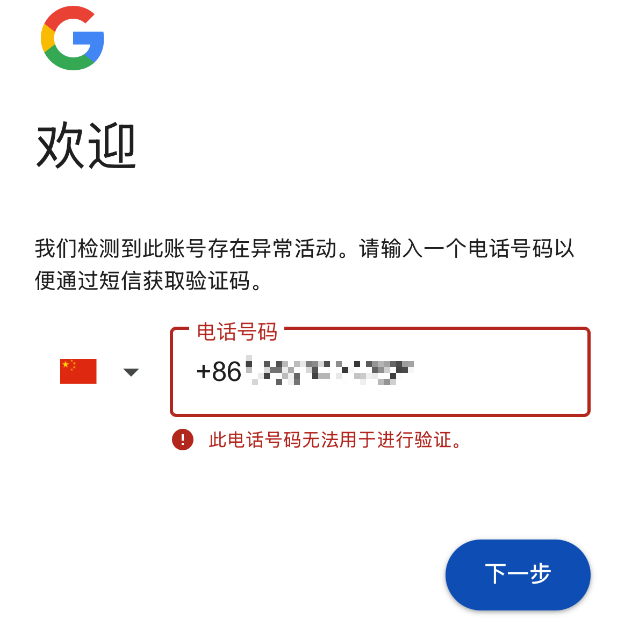 这个朋友的已有谷歌账号登录的时候,一开始提示账号存在异常活动,需要使用手机号码获取短信验证码去恢复账号。但是使用了自己和亲友的多个手机号码都无法用于进行验证。